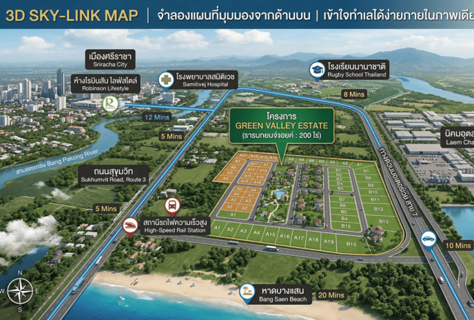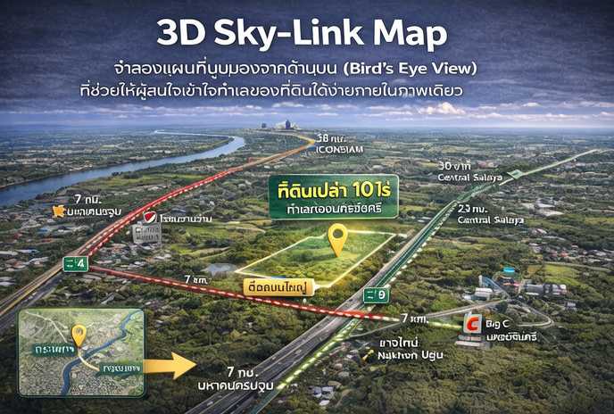 แผนที่ Bird’s Eye View แสดงทำเลและสถานที่สำคัญรอบที่ดิน ทำให้ผู้ซื้อเข้าใจพื้นที่ได้ง่ายภายในภาพเดียว